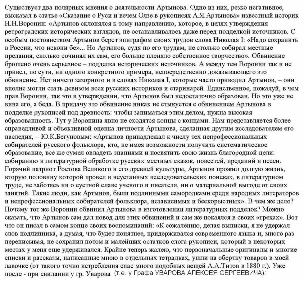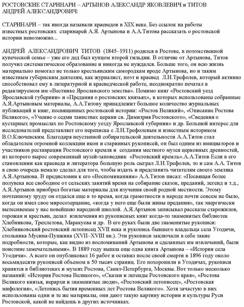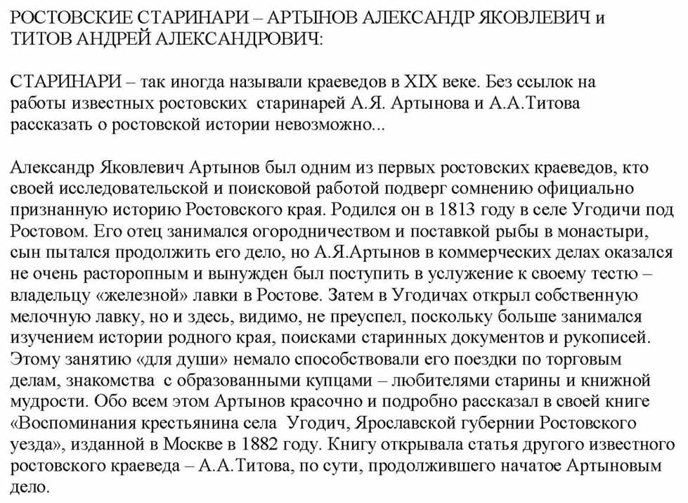 Старинари – так иногда называли краеведов в XIX веке. Без ссылок на работы известных ростовских старинарей АЛЕКСАНДРА ЯКОВЛЕВИЧА АРТЫНОВА ( http://aleksandr-artynov.narod.ru - годы жизни 1813 - 1896, всего прожил 83 года) и АНДРЕЯ АЛЕКСАНДРОВИЧА ТИТОВА ( http://andrey-titov1.narod.ru ) рассказать о ростовской истории невозможно. Одним из первых ростовских краеведов, кто своей исследовательской и поисковой работой подверг сомнению официально признанную историю Ростовского края был АЛЕКСАНДР ЯКОВЛЕВИЧ АРТЫНОВ ( http://aleksandr-artynov.narod.ru ):