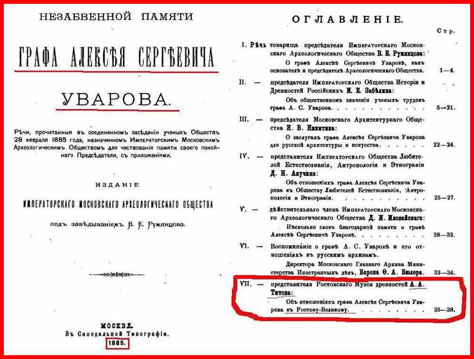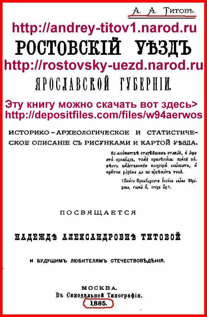 Полностью ценнейшую уникальнейшую старинную (1885 года издания, 625 страниц) книгу А. А. ТИТОВ РОСТОВСКИЙ УЕЗД скачать можно здесь> http://depositfiles.com/files/w94aerwos