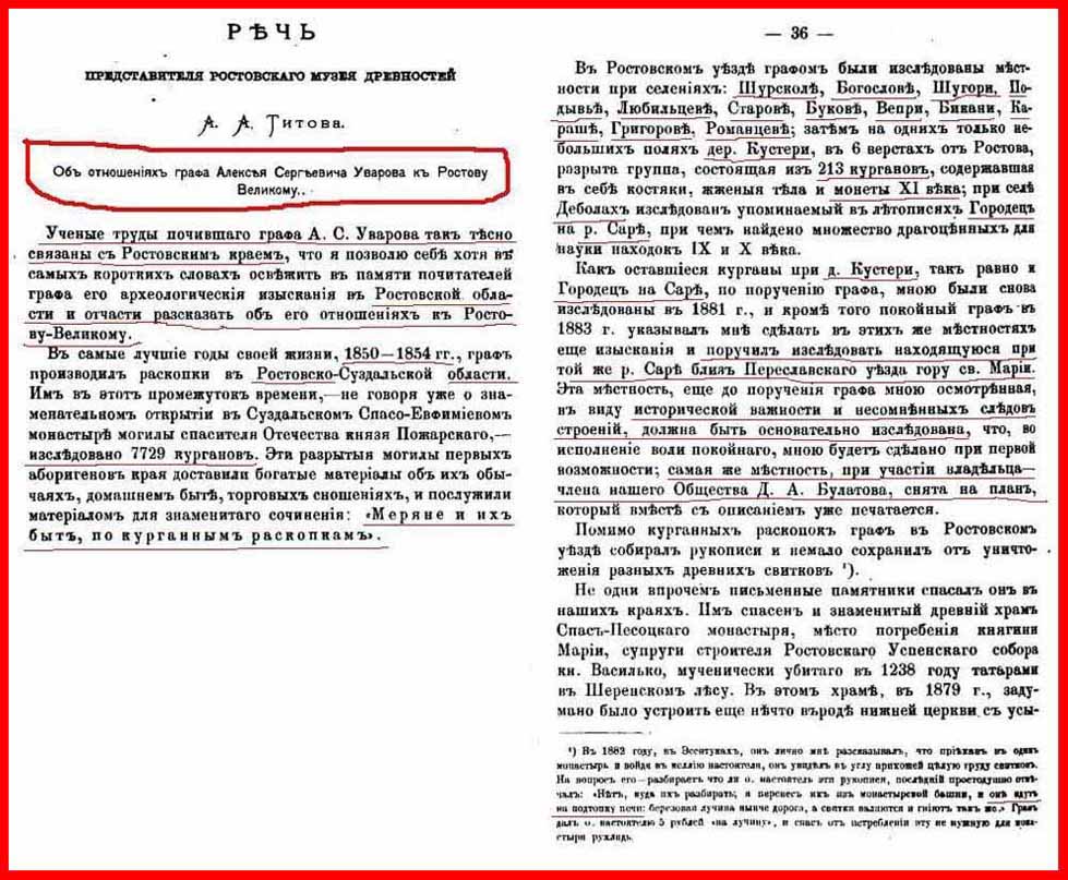 Знаменитый краевед Святой Земли Ростовской Граф АЛЕКСЕЙ СЕРГЕЕВИЧ УВАРОВ (годы жизни 1825 - 1884, всего прожил 59 лет) - потомок богатейшей аристократической семьи. Его отец - министр Народного Просвещения РОССИИ, Президент АКАДЕМИИ НАУК РОССИИ - Граф СЕРГЕЙ СЕМЁНОВИЧ УВАРОВ, (родился в 1786 году, умер 05 сентября 1855 года, всего прожил 69 лет). Граф АЛЕКСЕЙ СЕРГЕЕВИЧ УВАРОВ пренебрег карьерой, высоким служебным положением, сулившим ему всяческие почести и отличия и выбрал путь изучения российских древностей, стал археологом, человеком непонятной для высшего света профессии, каким-то «старинарем». За свои деньги он ведет многочисленные раскопки в окрестностях РОСТОВА ВЕЛИКАГО и тщательно исследует там все известные и неизвестные курганы. Итогом этой изнурительной работы стала изданная им знаменитая книга А. С. УВАРОВ МЕРЯНЕ И ИХ БЫТ, ПО КУРГАННЫМ РАСКОПКАМ скачать можно здесь> http://depositfiles.com/files/jm7qspo5y