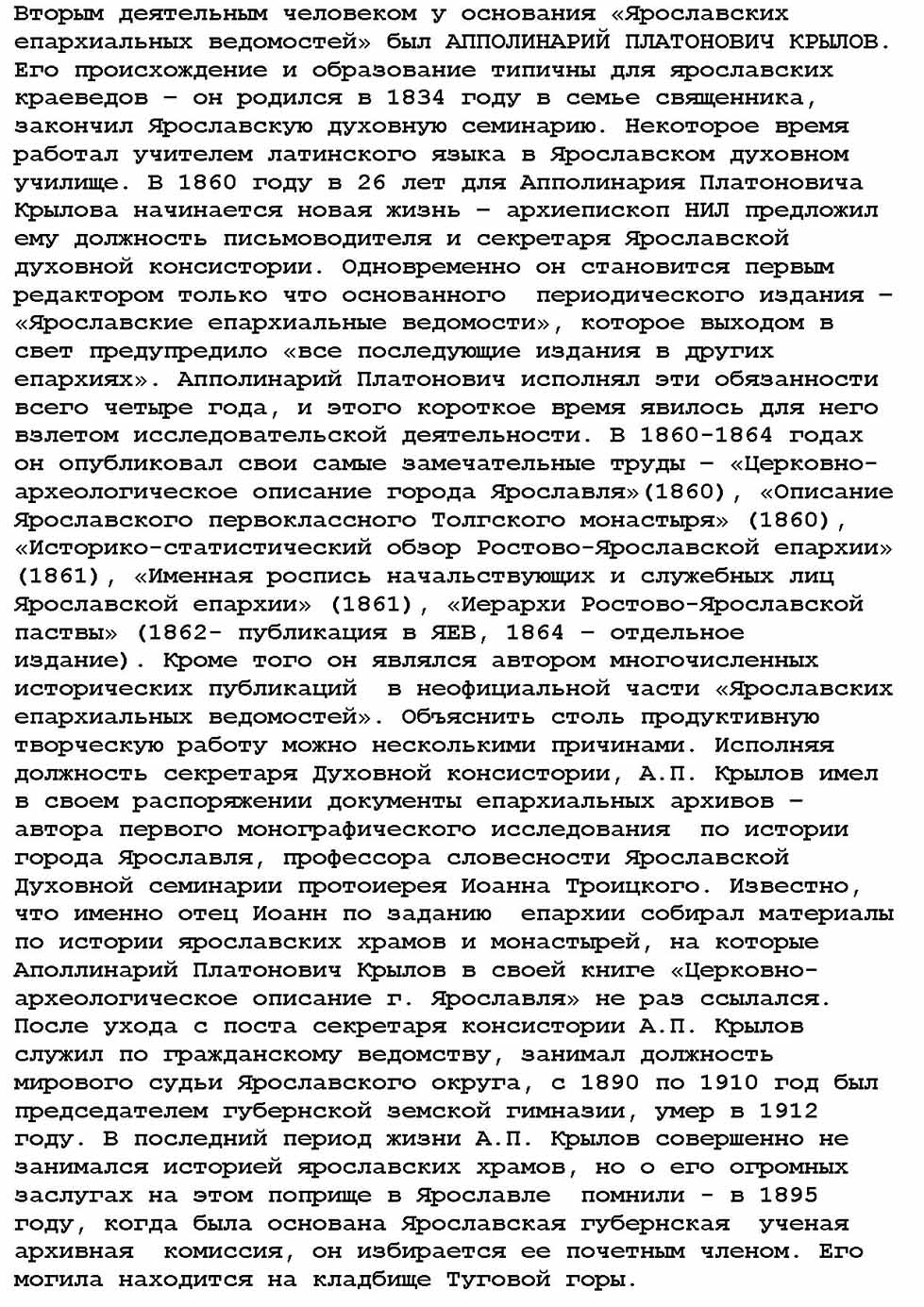 Самый первый (с 1860 года) главный редактор газеты ЯРОСЛАВСКИЕ ЕПАРХИАЛЬНЫЕ ВЕДОМОСТИ - сын Ярославского Священника ПЛАТОНА КРЫЛОВА - АПОЛИНАРИЙ ПЛАТОНОВИЧ КРЫЛОВ (годы жизни 1834 - 06.03.1912, всего прожил 78 лет):