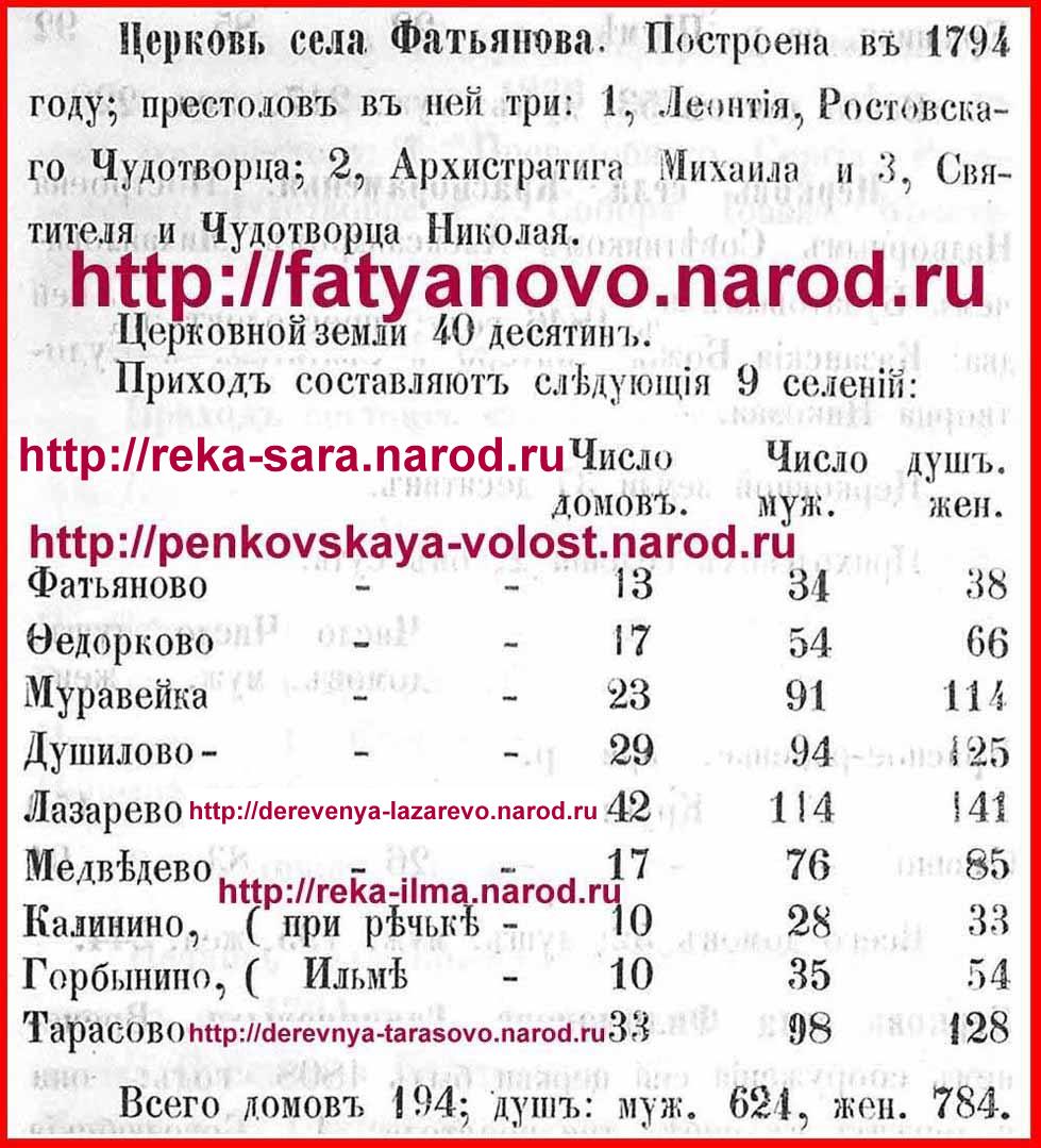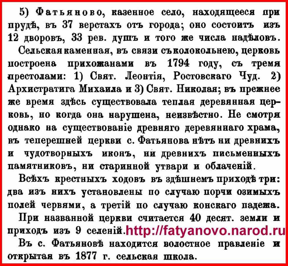 Из ценнейшей уникальной старинной ДОсоветской книги "ИСТОРИКО-СТАТИСТИЧЕСКИЙ ОБЗОР ЯРОСЛАВСКОЙ ЕПАРХИИ" (автор - сын Ярославского Священника ПЛАТОНА КРЫЛОВА - АПОЛИНАРИЙ ПЛАТОНОВИЧ КРЫЛОВ, типография ГЕРМАНА ФАЛЬКА, г. Ярославль, 1861 год, 902 страницы – эту книгу скачать можно по адресу> http://depositfiles.com/files/s8aw3q02w ) УСТАНОВЛЕНО, что красивейший каменный, в связи с высокой колокольнею, тёплый уютный Храм села ФАТЬЯНОВО возведён в 1794 году. ПРЕСТОЛЫ в нём - 1) СВЯТИТЕЛЯ ЛЕОНТИЯ ЕПИСКОПА РОСТОВСКОГО; 2) СВЯТАГО АРХИСТРАТИГА МИХАИЛА и 3) СВЯТИТЕЛЯ и ЧУДОТВОРЦА НИКОЛАЯ. В 1861 году земли при Храме было 40 десятин (примерно чуть больше 40 гектар). В 1861 году Приход этого Храма состоял из 9 (Д-Е-В-Я-Т-И) селений, а именно - 1) само село ФАТЬЯНОВО ( http://fatyanovo.narod.ru ), 2) деревни ФЕДОРКОВО, 3) деревни МУРАВЕЙКА, 4) деревни ДУШИЛОВО, 5) деревни ЛАЗАРЕВО ( http://lazarevo.narod.ru ), 6) деревни МЕДВЕДЕВО, 7) деревни КАЛИНИНО на ИЛЬМЕ ( http://reka-ilma.narod.ru ); 8) деревни ГОРБЫНИНО и 9) деревни ТАРАСОВО ( http://derevnya-tarasovo.narod.ru ). Всего в Приходе Храма села ФАТЬЯНОВО в 1861 году (а это год отмены крепостного права) был 194 дома, в которых жило 624 мужчин и 784 женщин, итого (624 + 784) : 194 = 1408:194 = примерно по 7 человек жило в каждом доме: