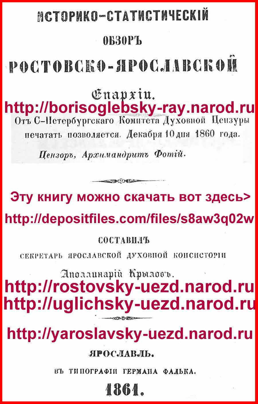 Полностью ценнейшую уникальную старинную ДОсоветскую книгу "ИСТОРИКО-СТАТИСТИЧЕСКИЙ ОБЗОР ЯРОСЛАВСКОЙ ЕПАРХИИ" (автор - сын Ярославского Священника ПЛАТОНА КРЫЛОВА - АПОЛИНАРИЙ ПЛАТОНОВИЧ КРЫЛОВ, типография ГЕРМАНА ФАЛЬКА, г. Ярославль, 1861 год, 902 страницы) скачать можно здесь> http://depositfiles.com/files/s8aw3q02w