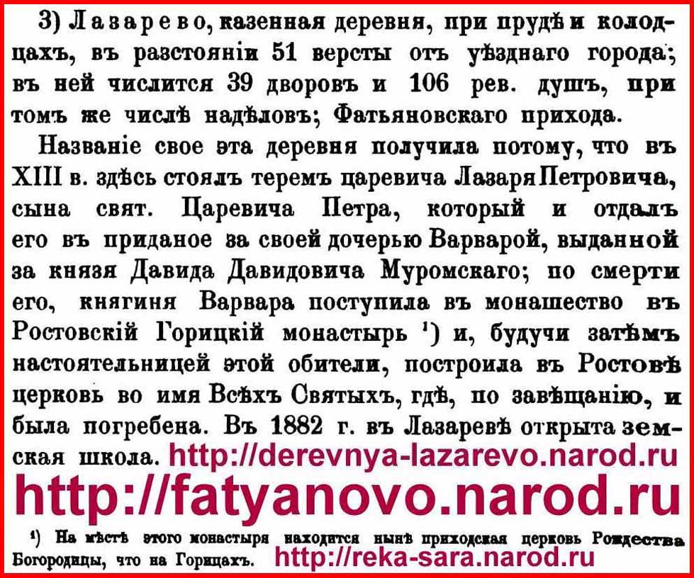 Из ценнейшей уникальной старинной (1885 года издания, 625 страниц) книги А. А. ТИТОВ - РОСТОВСКИЙ УЕЗД (скачать можно здесь> http://depositfiles.com/files/w94aerwos ) установлено что в 1885 году (т.е. через 24 года после отмены крепостного права) село ФАТЬЯНОВО ( http://fatyanovo.narod.ru ):