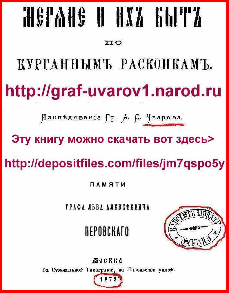 Полностью старинную (1872 года издания, 217 страниц) книгу А. С. УВАРОВ МЕРЯНЕ И ИХ БЫТ, ПО КУРГАННЫМ РАСКОПКАМ скачать можно здесь> http://depositfiles.com/files/jm7qspo5y