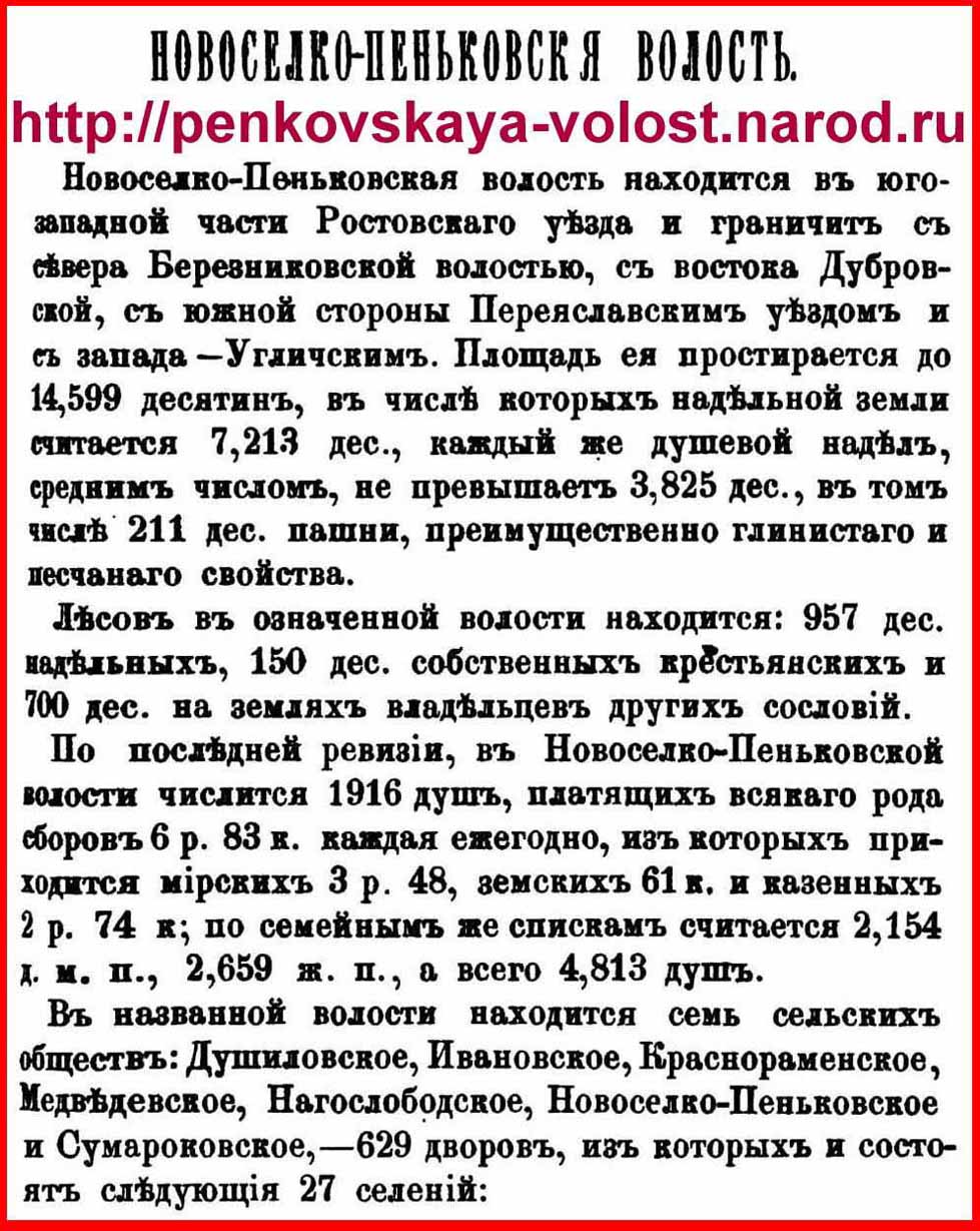 Из ценнейшей уникальной старинной (1885 года издания, 625 страниц) книги А. А. ТИТОВ - РОСТОВСКИЙ УЕЗД (скачать можно здесь> http://depositfiles.com/files/w94aerwos ) установлено что в 1885 году (т.е. через 24 года после отмены крепостного права) село ФАТЬЯНОВО ( http://fatyanovo.narod.ru ) входило в состав НОВОСЁЛКО-ПЕНЬКОВСКОЙ ВОЛОСТИ ( http://penkovskaya-volost.narod.ru ):