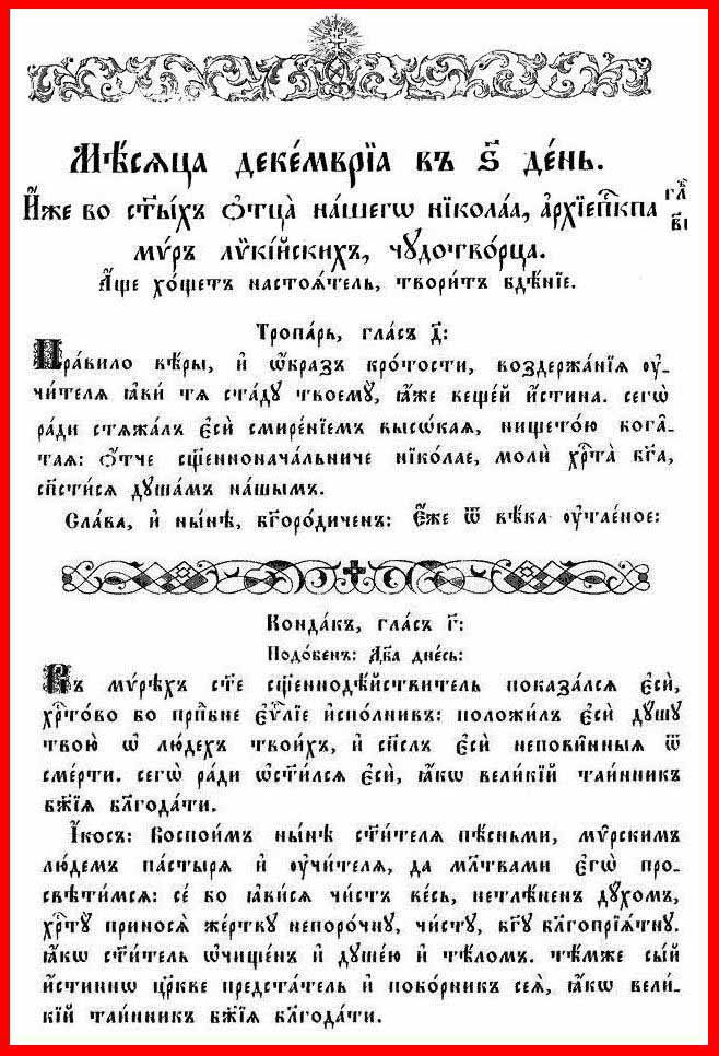 БОЖЕСТВЕННЫЕ ЛИТУРГИИ зимнего и летнего Престольных Праздников СВЯТИТЕЛЯ НИКОЛАЯ ЧУДОТВОРЦА служатся утром 19 ДЕКАБРЯ и 22 МАЯ (накануне же - т.е. вечером 18 ДЕКАБРЯ и вечером 21 МАЯ служится Праздничное ВСЕНОЩНОЕ БДЕНИЕ). Тропарь, Кондак и Икос ПРЕСТОЛЬНАГО ЗИМНЕГО ПРАЗДНИКА СВЯТИТЕЛЯ НИКОЛАЯ ЧУДОТВОРЦА, издревле Празднуемого всеми Приходскими селениями этого Храма по новому стилю 19 декабря (по старому стилю):
