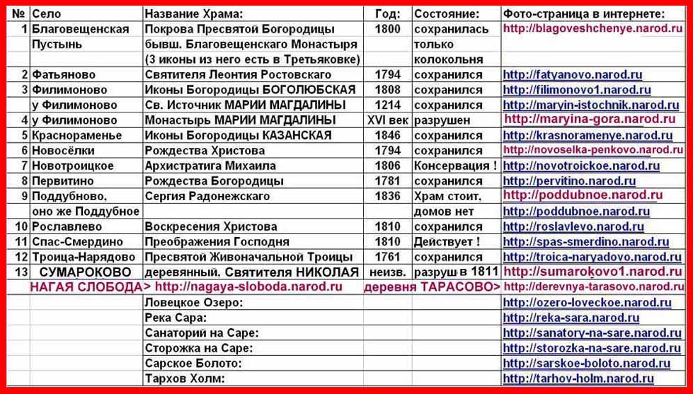 Список 10 (десяти) ближайших окрестных Храмов и др. интересных мест на реке САРА ( http://reka-sara.narod.ru ):
