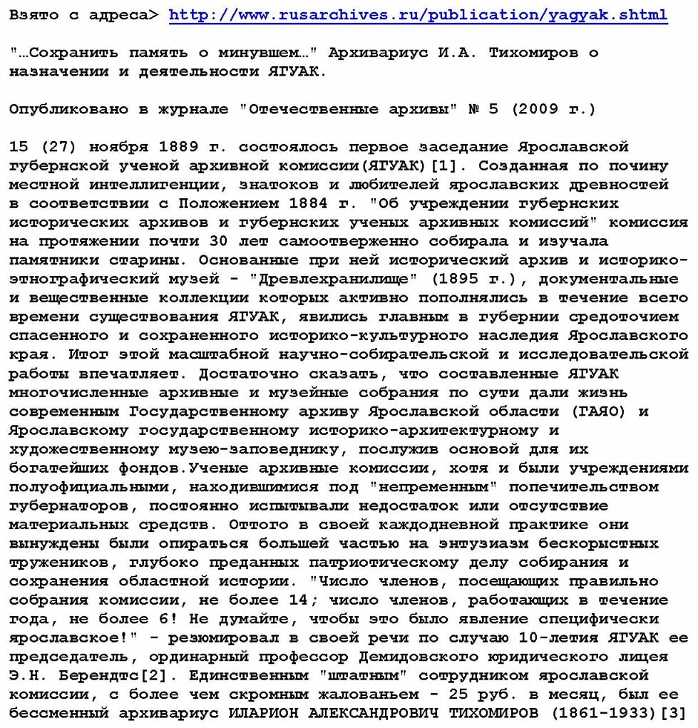"…СОХРАНИТЬ ПАМЯТЬ о МИНУВШЕМ…" Архивариус ИЛАРИОН АЛЕКСАНДРОВИЧ ТИХОМИРОВ о назначении и деятельности ЯГУАК. Опубликовано в журнале "Отечественные архивы" № 5 за 2009 год (взято с адреса> http://www.rusarchives.ru/publication/yagyak.shtml ):
