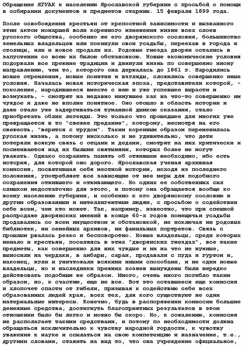 Обращение ЯГУАК (и лично ИЛАРИОНА АЛЕКСАНДРОВИЧА ТИХОМИРОВА) от 15 февраля 1899 года к населению Ярославской губернии с просьбой о помощи в собирании документов и предметов старины - часть 1-я: