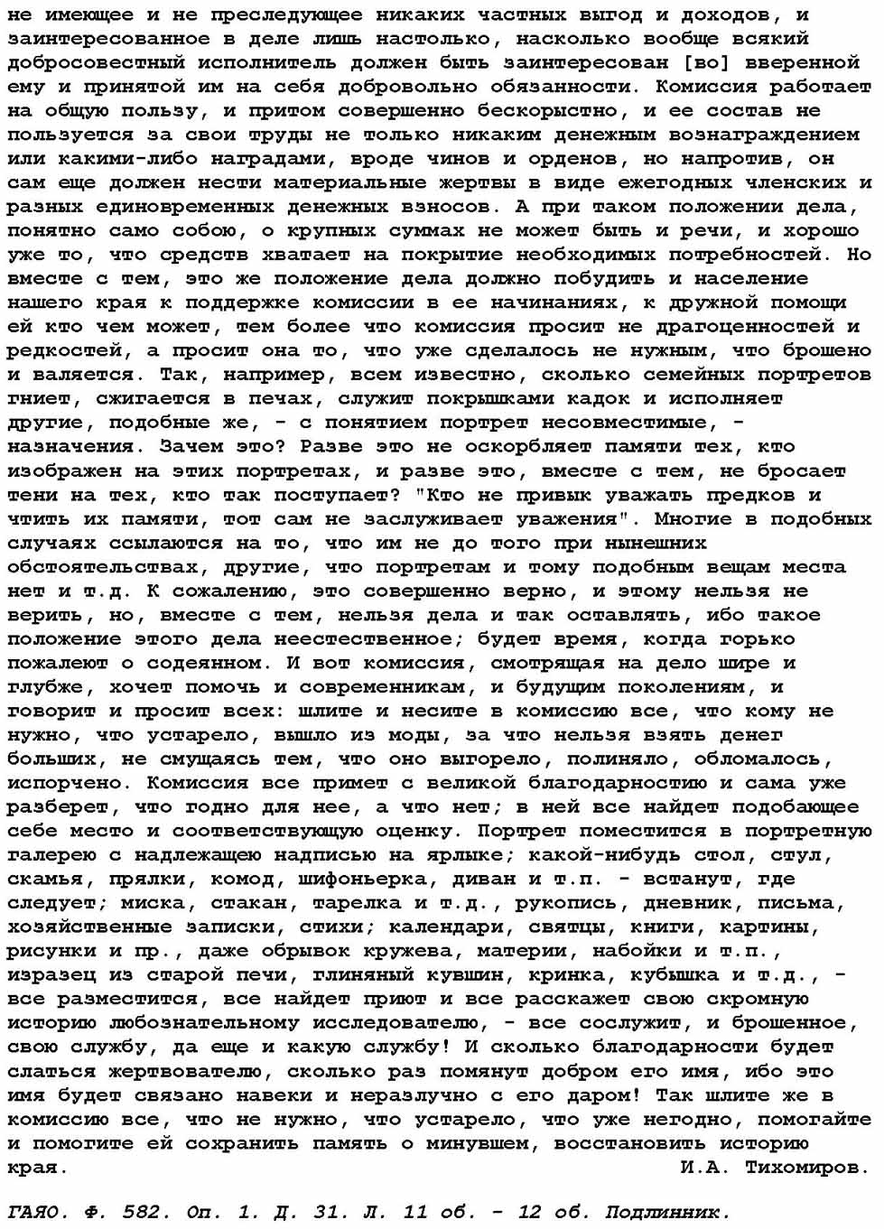 Обращение ЯГУАК (и лично ИЛАРИОНА АЛЕКСАНДРОВИЧА ТИХОМИРОВА) от 15 февраля 1899 года к населению Ярославской губернии с просьбой о помощи в собирании документов и предметов старины - часть 2-я: