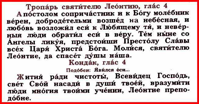 Божественная ЛИТУРГИЯ главного ПРЕСТОЛЬНАГО ПРАЗДНИКА - "Обретение Святых Мощей Святителя ЛЕОНТИЯ Епископа Ростовскаго Чудотворца и СОБОР ВСЕХ СВЯТЫХ В ЗЕМЛЕ РОСТОВО-ЯРОСЛАВСКОЙ ПРОСИЯВШИХ" совершается УТРОМ 5 июня по новому стилю. Накануне ВЕЧЕРОМ (4 июня по новому стилю) совершается Праздничное Всенощное Бдение - ТРОПАРЬ и КОНДАК Главного ПРЕСТОЛЬНОГО ПРАЗДНИКА Храма и села ФАТЬЯНОВО ( http://fatyanovo.narod.ru ) - Святителя ЛЕОНТИЯ Епископа Ростовского Чудотворца: